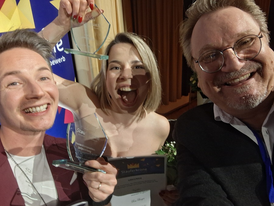 Resi Berger heißt die Gewinnerin der Stauferkrone 2026. Den internationalen deutschsprachigen Schlager-Contest, der am Wochenende in Donzdorf (Kreis Göppingen, Baden-Württemberg) stattfand, konnte die 27-Jährige mit ihrer überzeugenden Stimme und dem Wettbewerbsbeitrag „Vogelfrei“ klar für sich entscheiden. Das Lied gewann nicht nur den Jurypreis für die beste Interpretation, sondern auch den Preis für die beste Komposition, worüber sich vor allem Mitautor Damiano Maiolini freute. Berater Steve fügt noch hinzu, dass die Jurybewertung einstimmig war und neben dem ausgezeichneten Teamwork zwischen Resi und Damiano, was u.a. auch Text und Komposition angeht, gerade aber Resis Performance hier überhaupt keine Fragen mehr offen ließ, wer hier an dem Abend als Sieger hervorgeht.